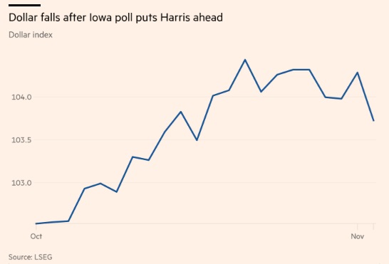 巴克莱(Barclays)驻纽约的外汇策略师Skylar Montgomery Koning说:“随着民意调查向有利于哈里斯的方向转变,美元面临压力。”