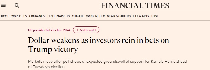 英国《金融时报》报道称,因全球市场减少对共和党候选人川普在美国总统大选中获胜的押注,美元周一走弱。