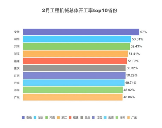 其中,浙江、安徽、湖南、河南、重庆等多地设备开工率超50%。
