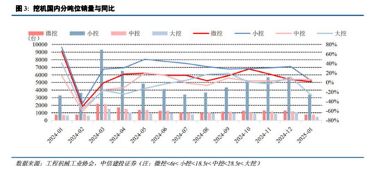 2024年全年,国内小挖、中挖、大挖全年销量同比分别24.6%、-8.1%、-7.7%。