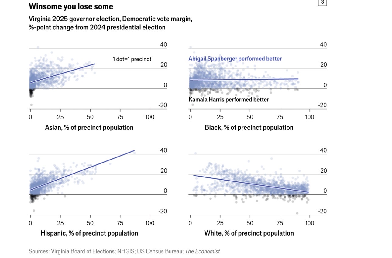 对弗吉尼亚的分析也显示出类似模式。在亚裔或西语裔人口较多的投票区,民主党候选人斯潘伯格的表现显著优于哈里斯。
