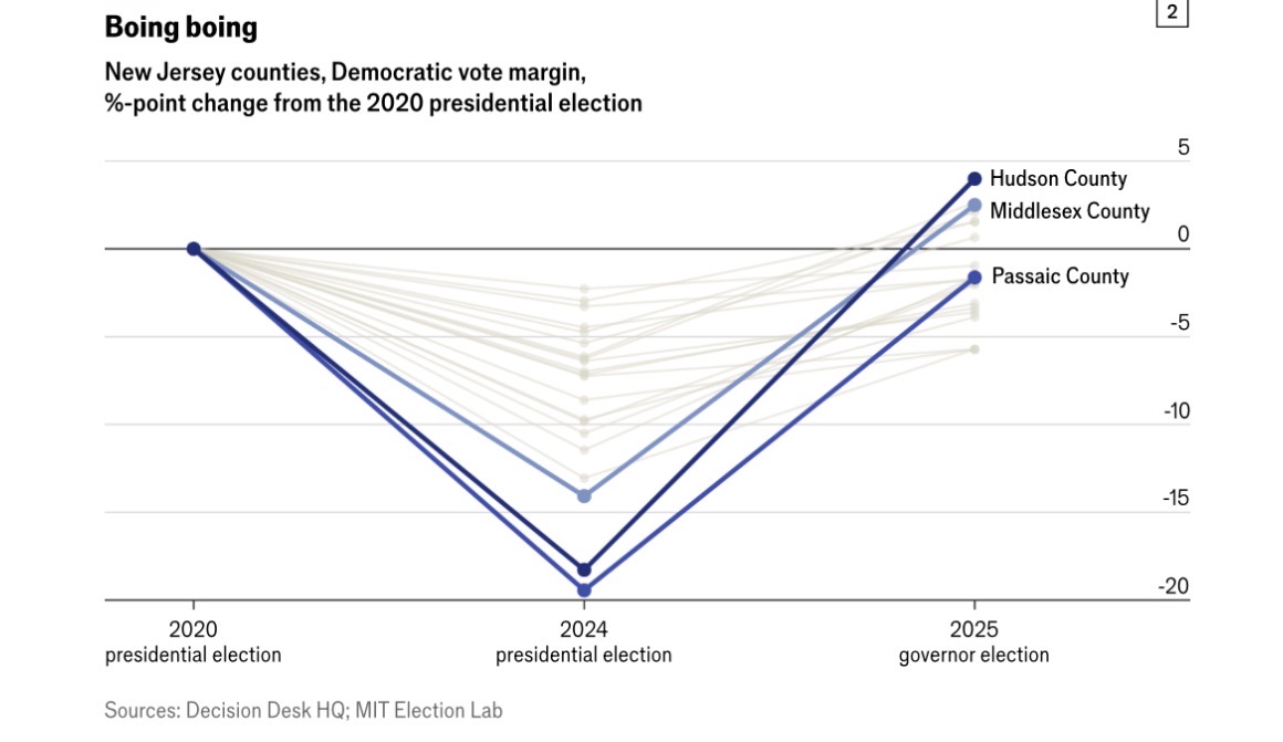 地方选举结果揭示了摇摆最大的地区。新泽西州的帕塞克县和哈德逊县在去年分别右转19和18个百分点,如今却出现了全州最显著的左转,支持新当选的民主党州长雪莉尔。