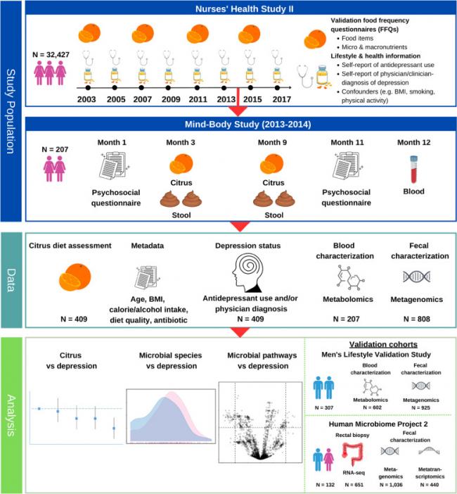 图1:识别可能调节柑橘摄入量和抑郁症之间关系的肠道微生物种类和代谢途径