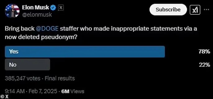 在埃莱兹辞职的数小时后,马斯克在社交媒体X上发起投票,询问公众是否应让他回归DOGE。