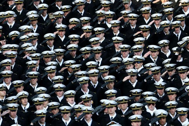 2024年12月14日,美国陆军学院与海军学院举行年度橄榄球赛。图为海军学院学员在奏国歌时肃站立。(Getty Images)