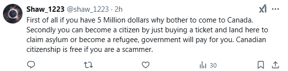 “首先,如果你有$500万美元,为什么还要来加拿大?其次,你只需要买张机票落地,就能申请庇护或成为难民,政府还会为你买单。在加拿大,只要你是个骗子,就能免费获得公民身份。”