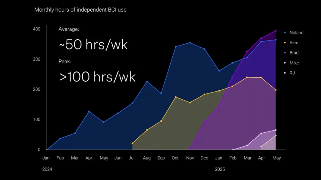 图表显示,他们平均每周使用约BCI设备的时间大概在50小时,峰值使用时间甚至超过了每周100小时,几乎只要是清醒的时间都在用。